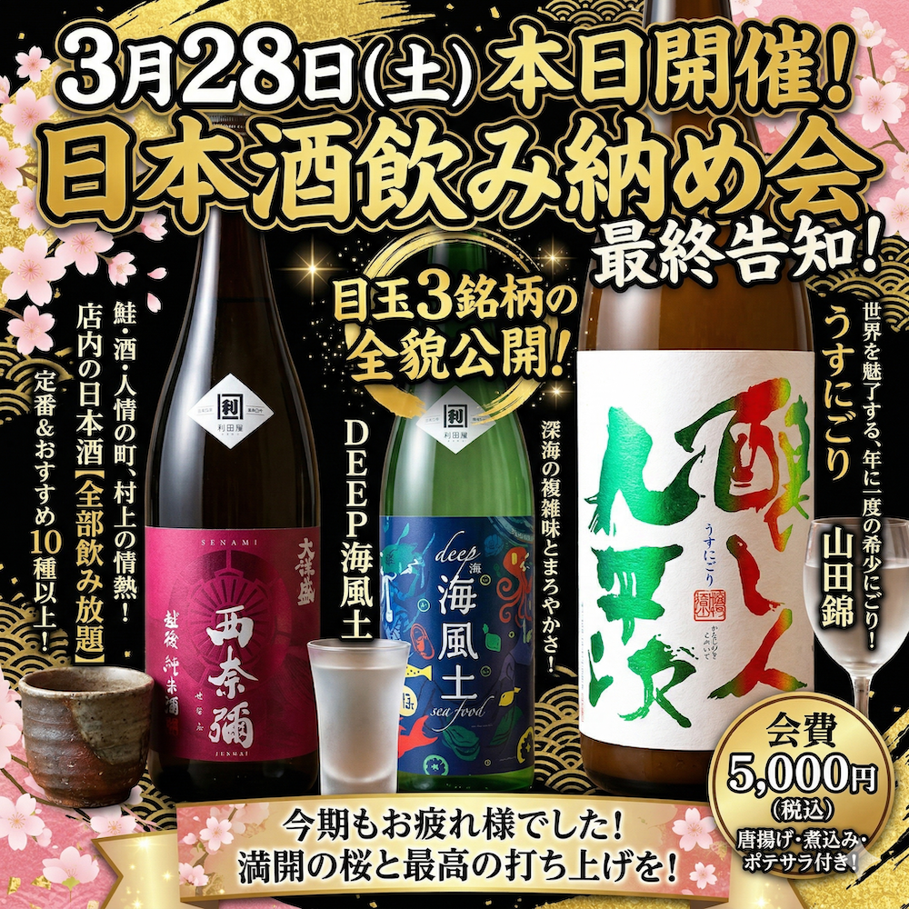 - 予約方法: 公式LINEより 「3/28日本酒会」「お名前」「人数」 をお送りください!